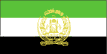three equal horizontal bands of green (top), white, and black with a gold emblem centered on the three bands; the emblem features a temple-like structure with Islamic inscriptions above and below,